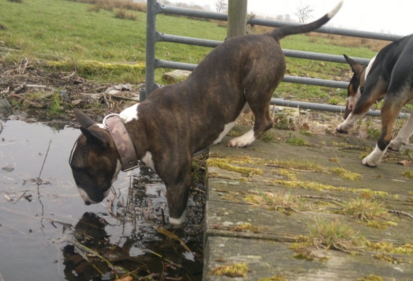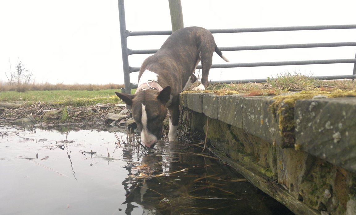 16 maart 2012: Bolletje krijgt tijdens een wandeling dorst, drinken van de brug lost hij creatief op. Daar wij ontelbaar veel slootjes om ons heen hebben waar onze honden uit kunnen drinken laten we ze jaarlijks ook tegen de Ziekte van Weil enten.