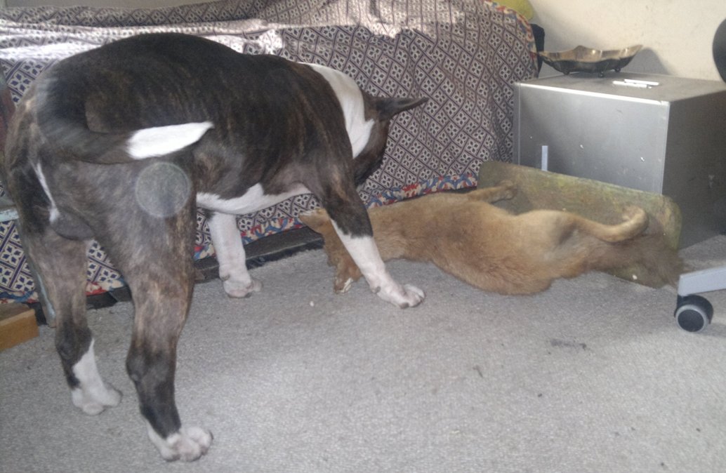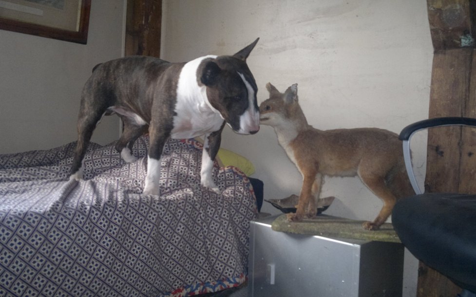 3 maart 2012: Bolletje ontmoet de opgezette vos in ons opkamertje, dat vond onze majesteit wel heel spannend, haha!