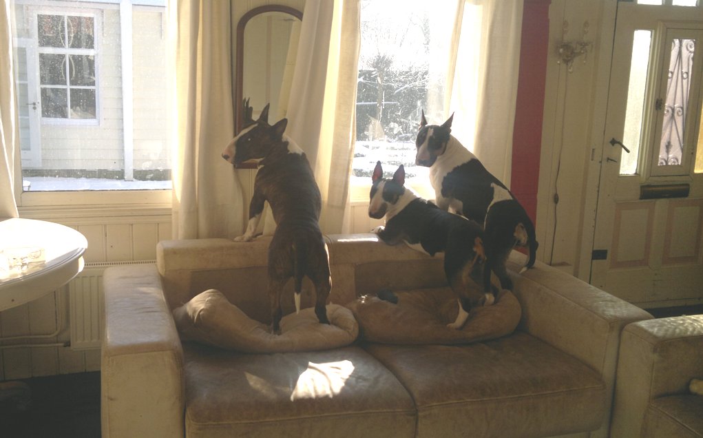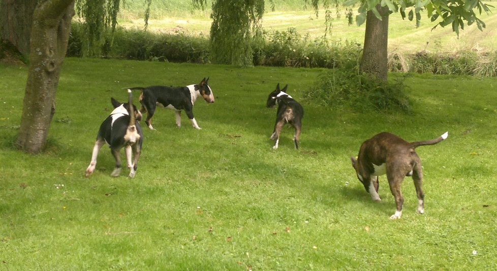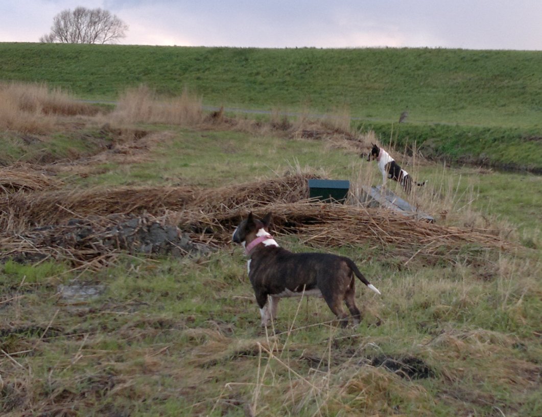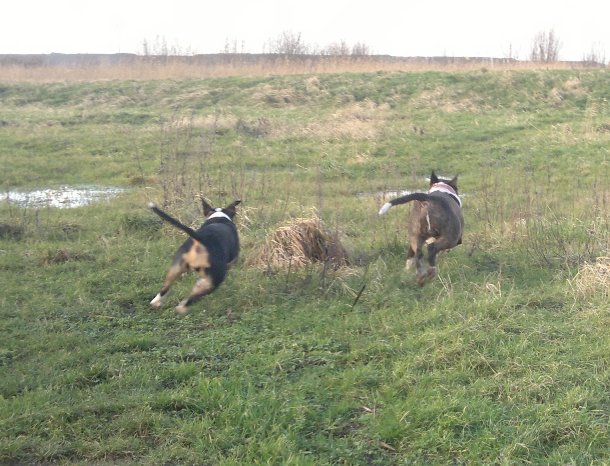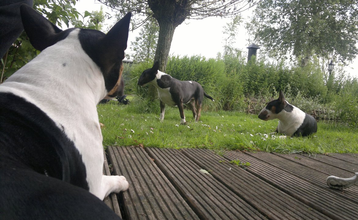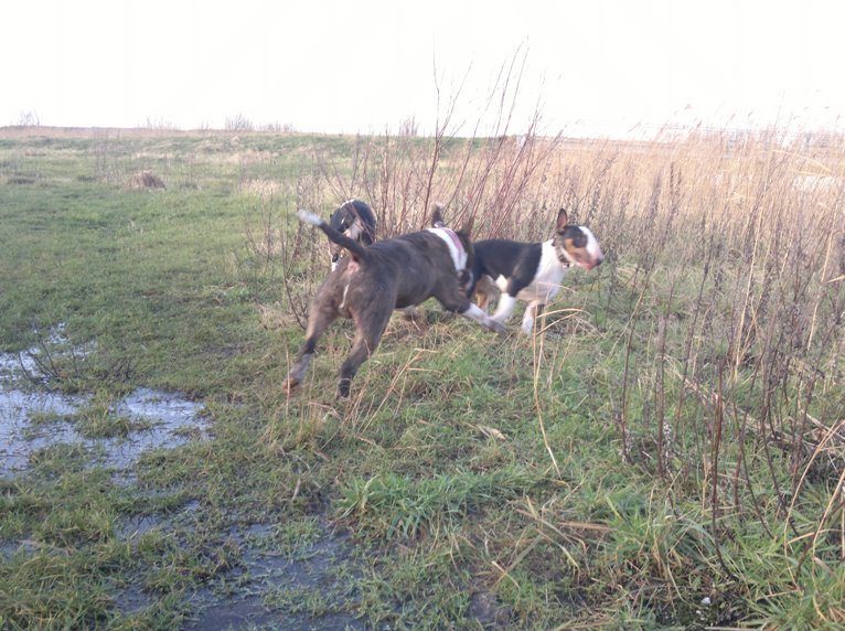 22 januari 2012: Tess en Bolletje doen samen een gekke bullie run. Gladys, die sowieso een beetje hormonaal is op het ogenblik, vindt het een beetje te wild worden en denkt dat ze 'haar kindje' Tess moet beschermen. Niets is minder waar, ik denk dat ze beter Bolletje zou kunnen beschermen, die doet echt geen vlieg kwaad. Verder niks aan de hand hoor... Bullterriers kunnen wel tegen een stootje.
