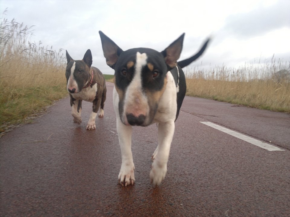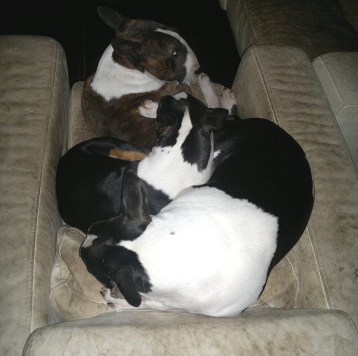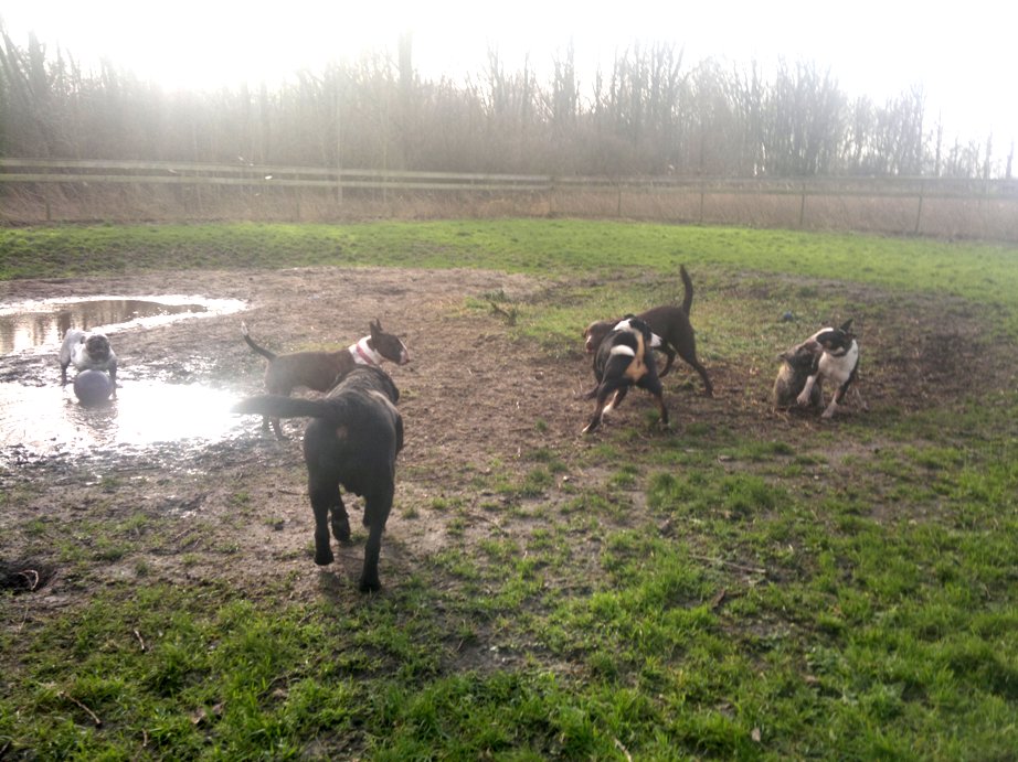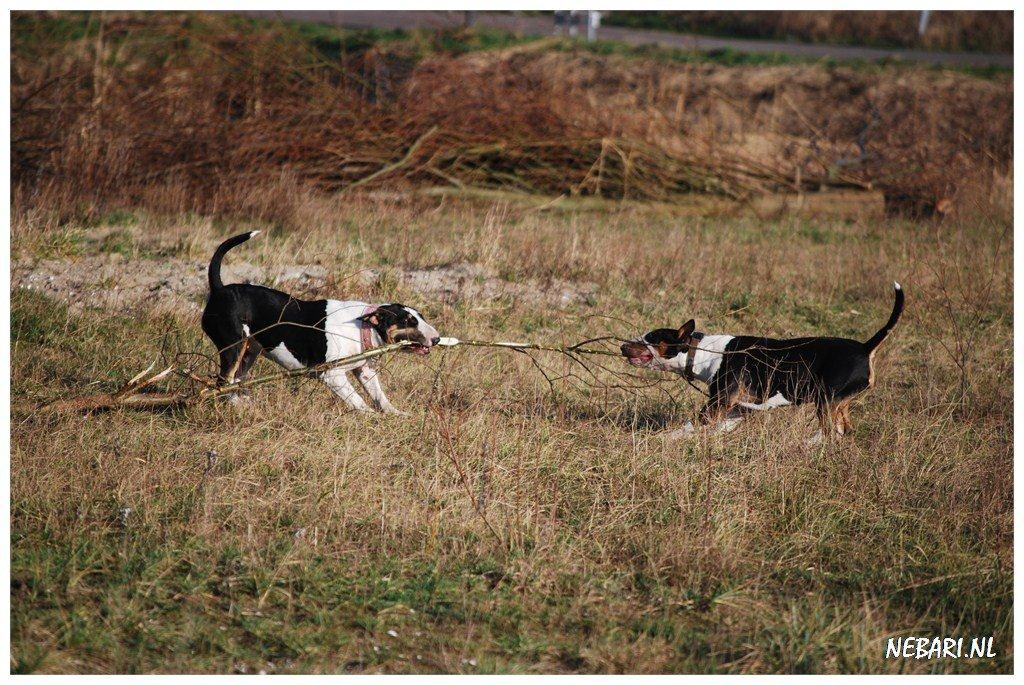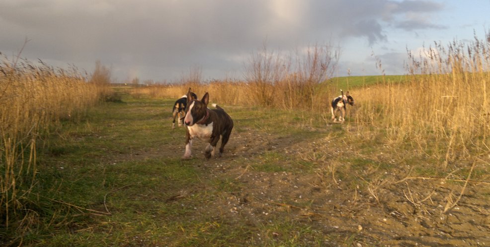 22 januari 2012: Tess en Bolletje doen samen een gekke bullie run. Gladys, die sowieso een beetje hormonaal is op het ogenblik, vindt het een beetje te wild worden en denkt dat ze 'haar kindje' Tess moet beschermen. Niets is minder waar, ik denk dat ze beter Bolletje zou kunnen beschermen, die doet echt geen vlieg kwaad. Verder niks aan de hand hoor... Bullterriers kunnen wel tegen een stootje.