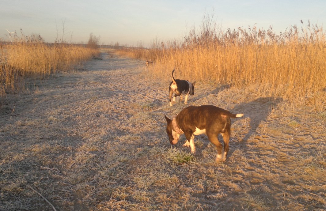 15 januari 2012: met ons roedeltje alles kits. Bolletje heeft na een week intensief Gladys dekken en daarna 2 dagen rust vandaag weer lekker veel energie tijdens onze wandeling. Mooie natuurlijke dekkingen trouwens, Bolletje is echt een lieve minnaar: als Gladys aangeeft zin te hebben eerst een beetje voorspel, oortjes sabbelen enzo, dan dekken en na het vreugdedansje van Gladys lief tegen elkaar aan gaan liggen. Afgelopen woensdag was Bolletje samen met Tess mee met de uitlaatservice, dit keer zonder mij: Mister Majestic gedraagt zich voorbeeldig in de roedels van Mirjam en Daphne, fijn. Hieronder weer een paar foto's.