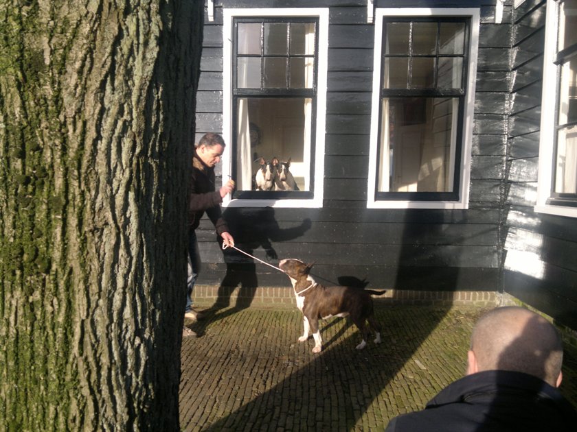 Martin laat Bolletje poseren, Marcel neemt een foto, mijn 2 meiden bezien het circus vanuit de warme huiskamer...
