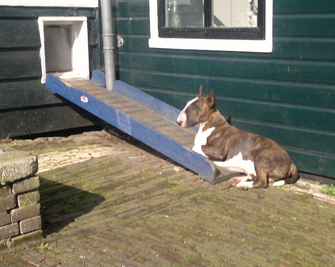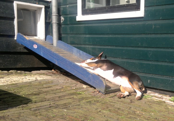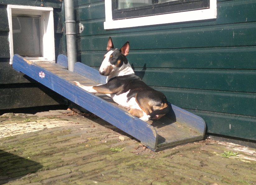 Ook Tess vindt het loopplankje naar het hondendeurtje wel een lekker warm beschut plekje...