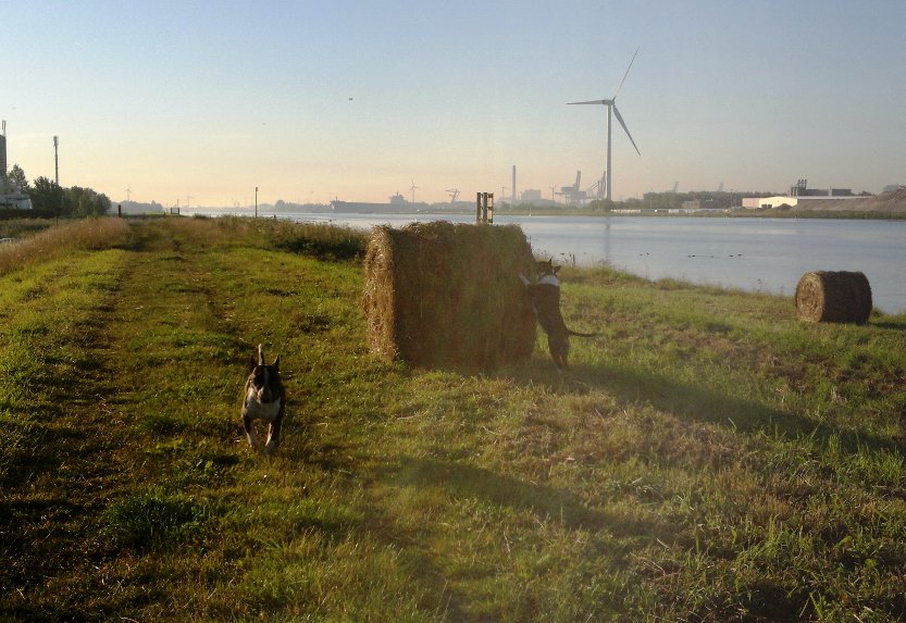 24 juli 2012: eindelijk mooi weer tijdens onze ochtendwandeling! Langs het kanaal allemaal strobalen, dat vonden de hondjes toch wel vreemd...