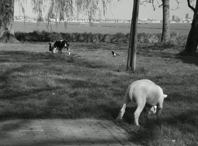 Wij hebben drie eksters die veel in onze tuin vertoeven, twee vrouwtjes en een mannetje. Ze zijn hier al heel lang, onze wijlen poes Merlijn hield hele scheldpartijen met ze, zij onder de boom, de drie eksters uitdagend kwetterend net boven haar. Maar de BT's gedijen ze goed. Heel vreemd, want ik heb Gladys een tijdje Ozzy genoemd, nadat ze binnen vijf minuten twee postduiven in de tuin had gevild (Gladys heeft het overigens nog steeds niet op duiven, ik geef haar groot gelijk, ik noem ze zelf naar Aron rats with wings, dat terzijde), maar eksters vindt Gladys okay. De eksters komen meegenieten als de honden in de tuin een bot eten, kruimeldiefjes, en als de honden met het bot klaar zijn, peuzelen zij het verder op.