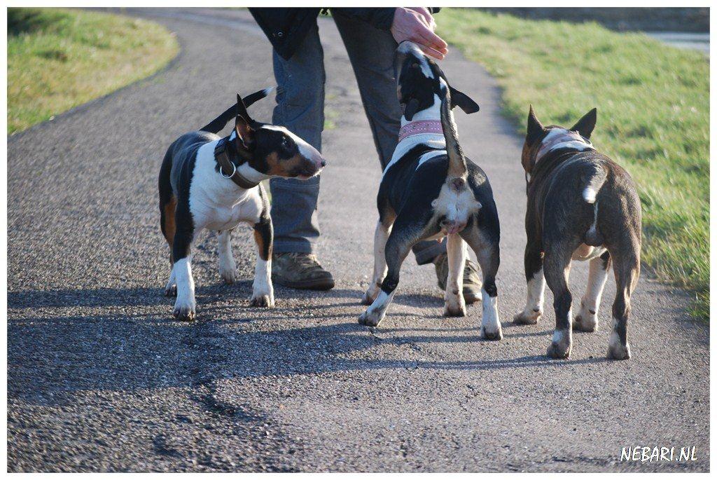Op het overdreven beschermende gedrag van Gladys richting Tess heb ik iets gevonden: zodra Bolletje, aangezet door Tess en samen met Tess aan hun wilde bullie runs en stoeipartijen beginnen (elke wandeling wel een keer) roep ik Gladys (via een hondenkoekje) bij me. Gladys en ik kijken dan, al rustig koekjes etend (dan heb ik de aandacht), het wilde spel van Bolletje en Tess aan. We hebben dit nu al drie keer succesvol geoefend! Mooi hoor, aandacht verleggen, positief gedrag belonen, negatief gedrag negeren, werkt altijd (als je maar genoeg hondenkoekjes mee hebt, haha).